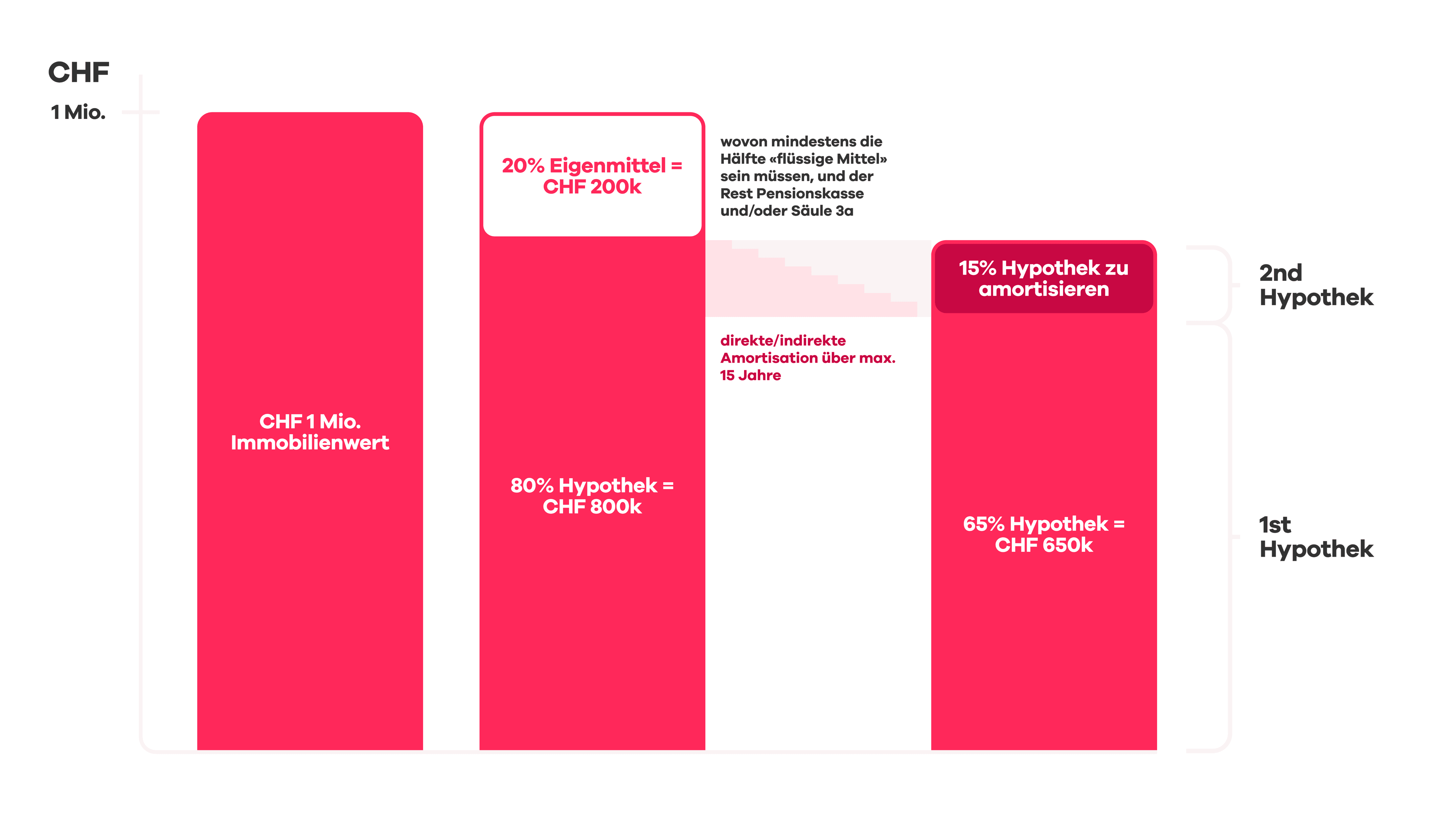 Für die Amortisation verlangen die Finanzinstitute von dir, dass du einen Teil des Kredits zurückzahlst, damit dein LTV nicht höher als 66.67% ist. Wenn dein LTV über 66.67% liegt, befindest du dich immer noch in der zweiten Hypothek.