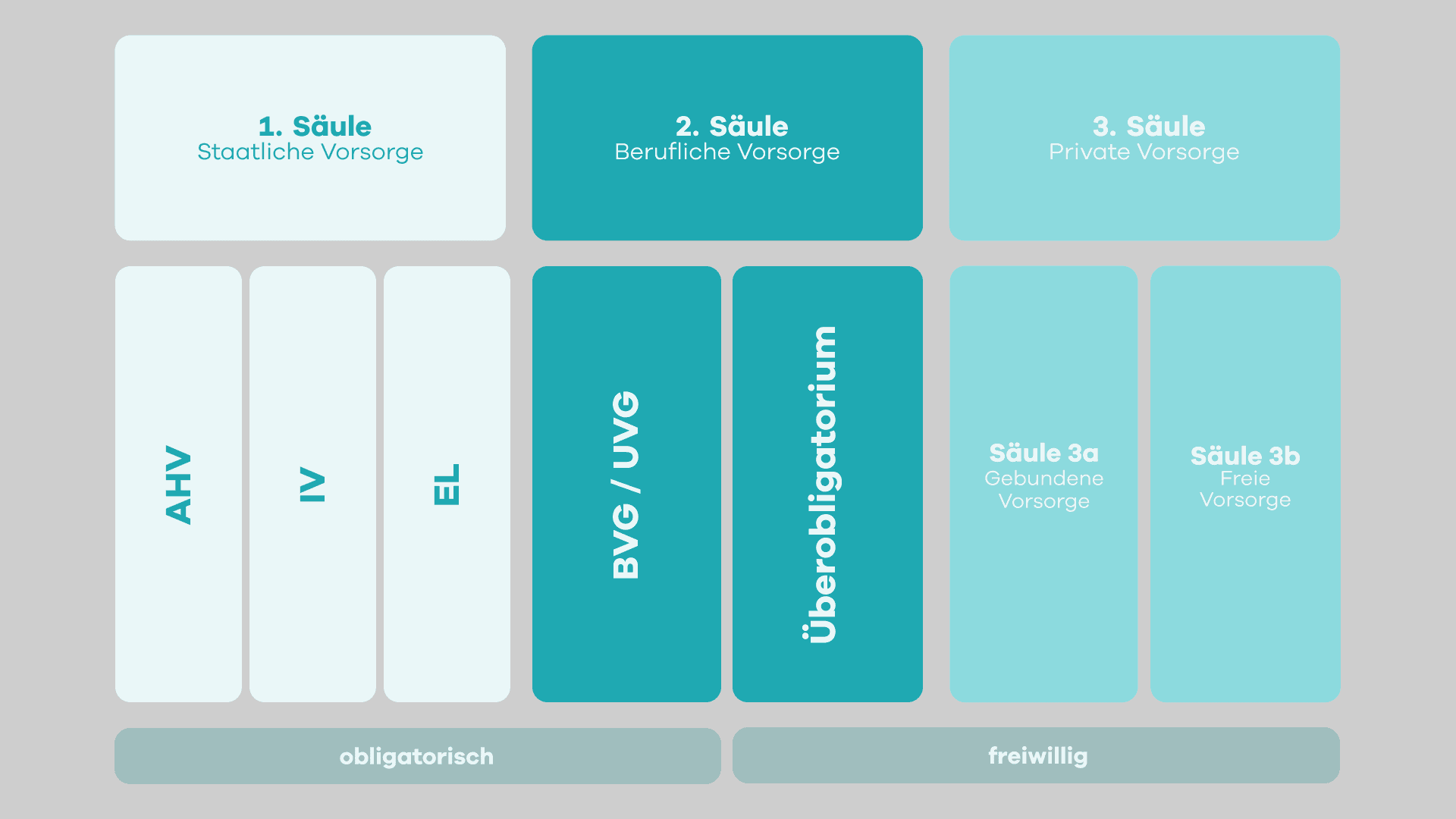 In der Schweiz basiert die Vorsorge auf einem Drei-Säulen-System und sorgt dafür, dass Menschen in der Schweiz im Alter, bei Invalidität oder im Todesfall finanziell abgesichert sind. Die staatliche und die berufliche Vorsorge (1. und 2. Säule) sind obligatorisch und werden von der privaten, freiwilligen Vorsorge (3. Säule) ergänzt. Diese drei Säulen greifen ineinander und bilden gemeinsam das Fundament unserer sozialen und finanziellen Sicherheit.