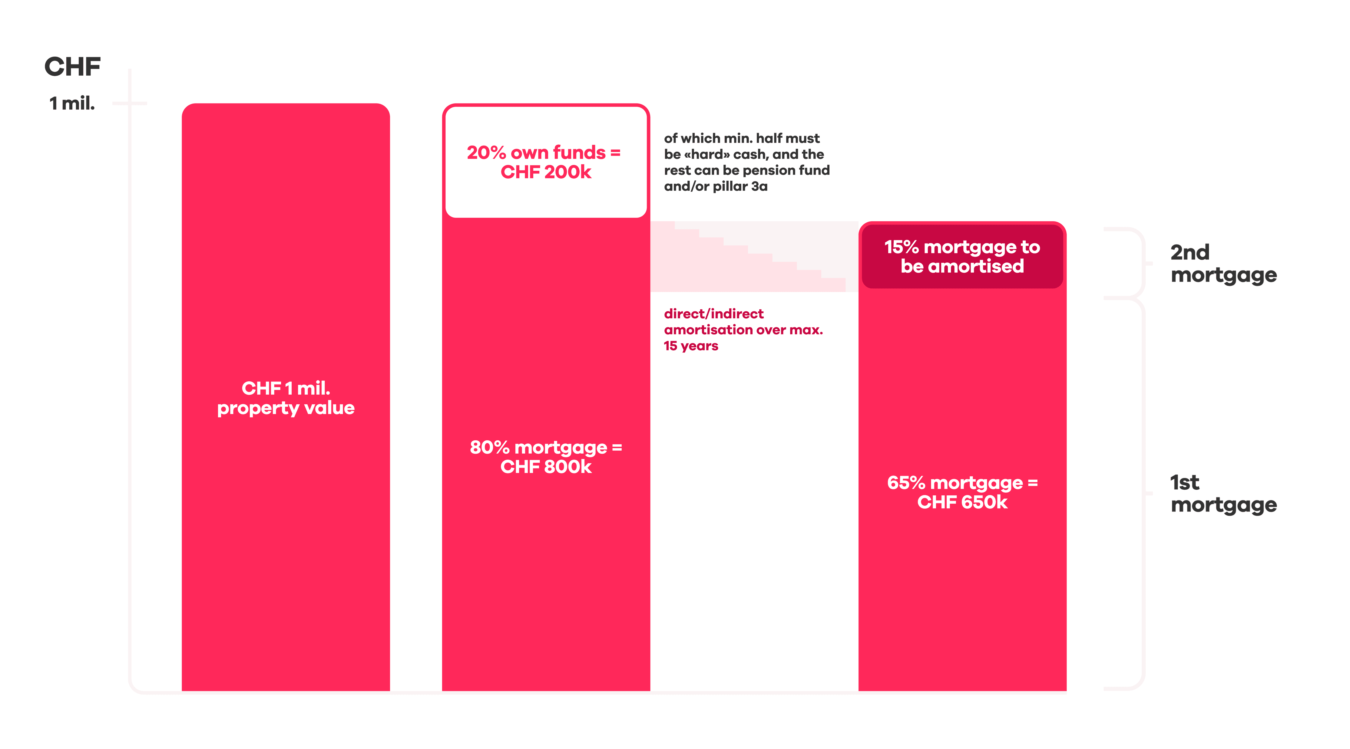 The whole process of repaying the loan is called «amortisation». And the part that financial institutions in Switzerland will ask you to pay back is called the «second mortgage», while the part that will remain (in most cases) and enable tax deductions is called the «first mortgage». Together, your first and second mortgage consist of up to 80% of the property’s value (that is, your LTV).