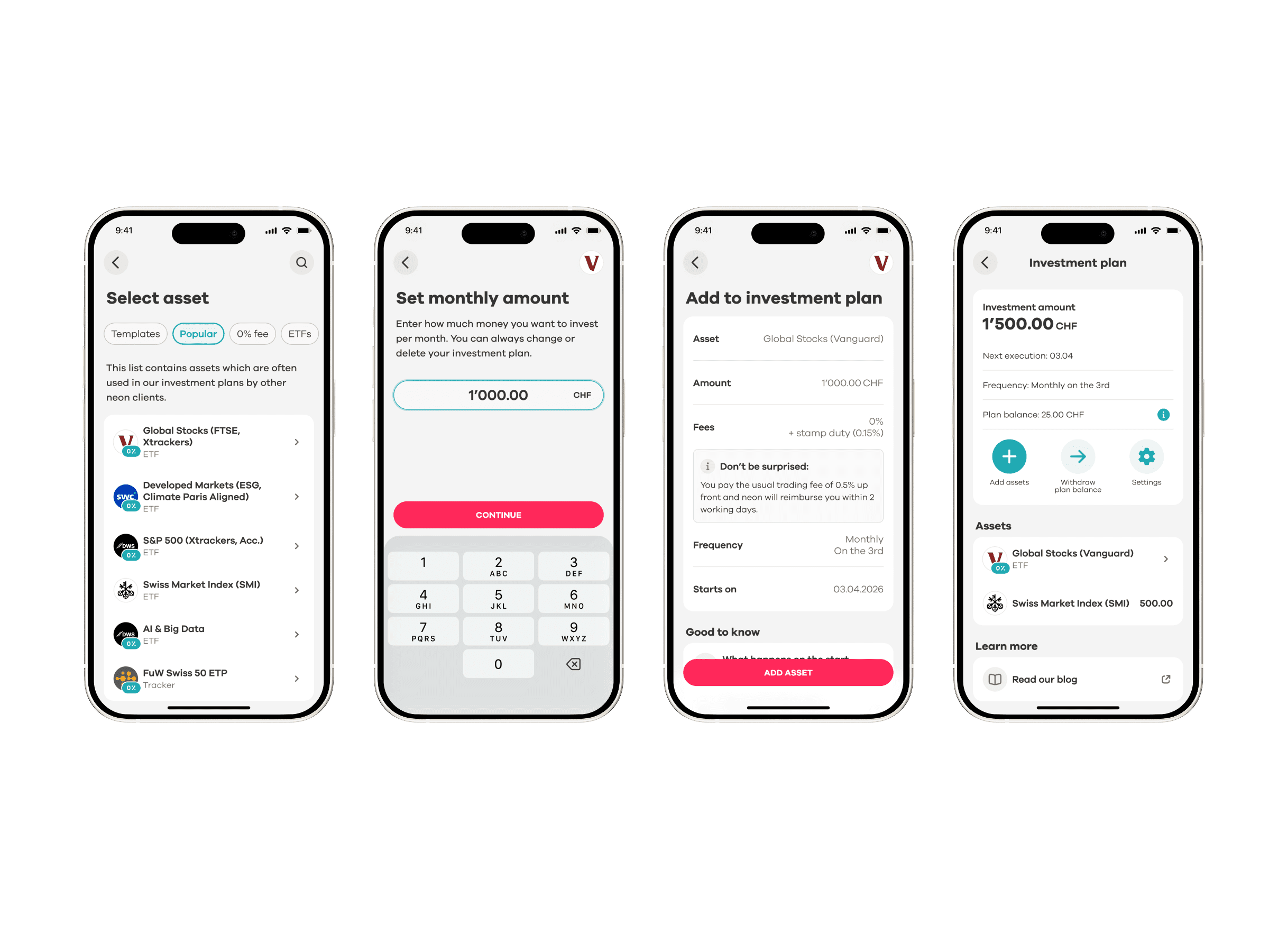 With the neon investment plan, wealth accumulation is easy. You select up to six shares or ETFs and set the amount you want to invest each month. Then you can sit back and relax, because we take care of the rest – we automatically invest for you once a month. All at the usual low costs.