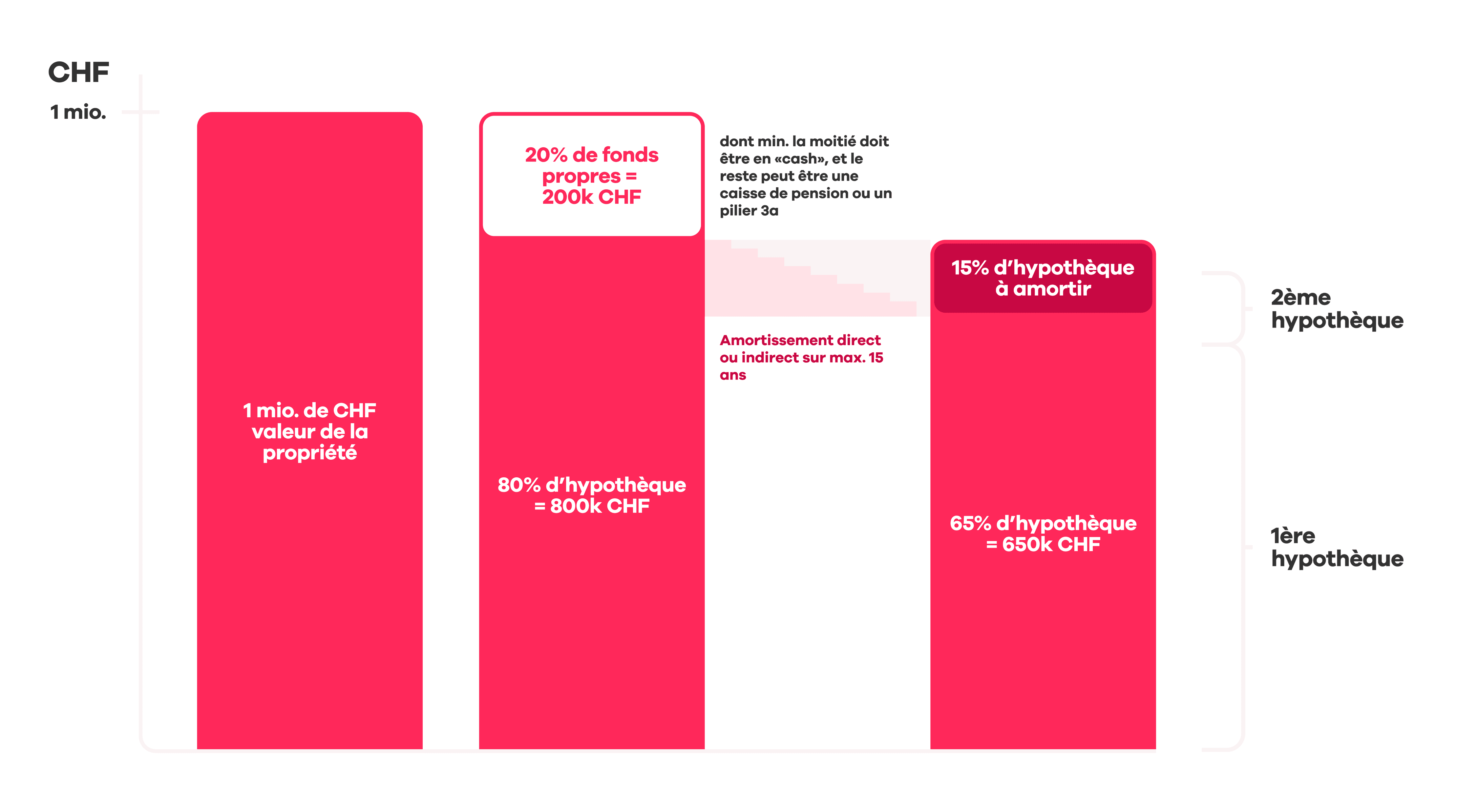 L'ensemble du processus de remboursement du prêt est appelé «amortissement». Et la partie que les institutions financières en Suisse te demanderont de rembourser s'appelle la«deuxième hypothèque», tandis que la partie qui restera (dans la plupart des cas) et permettra des déductions fiscales s'appelle la«première hypothèque». Ensemble, ta première et ta deuxième hypothèque représentent jusqu'à 80 % de la valeur de la propriété (c'est-à-dire ton ratio prêt-valeur).