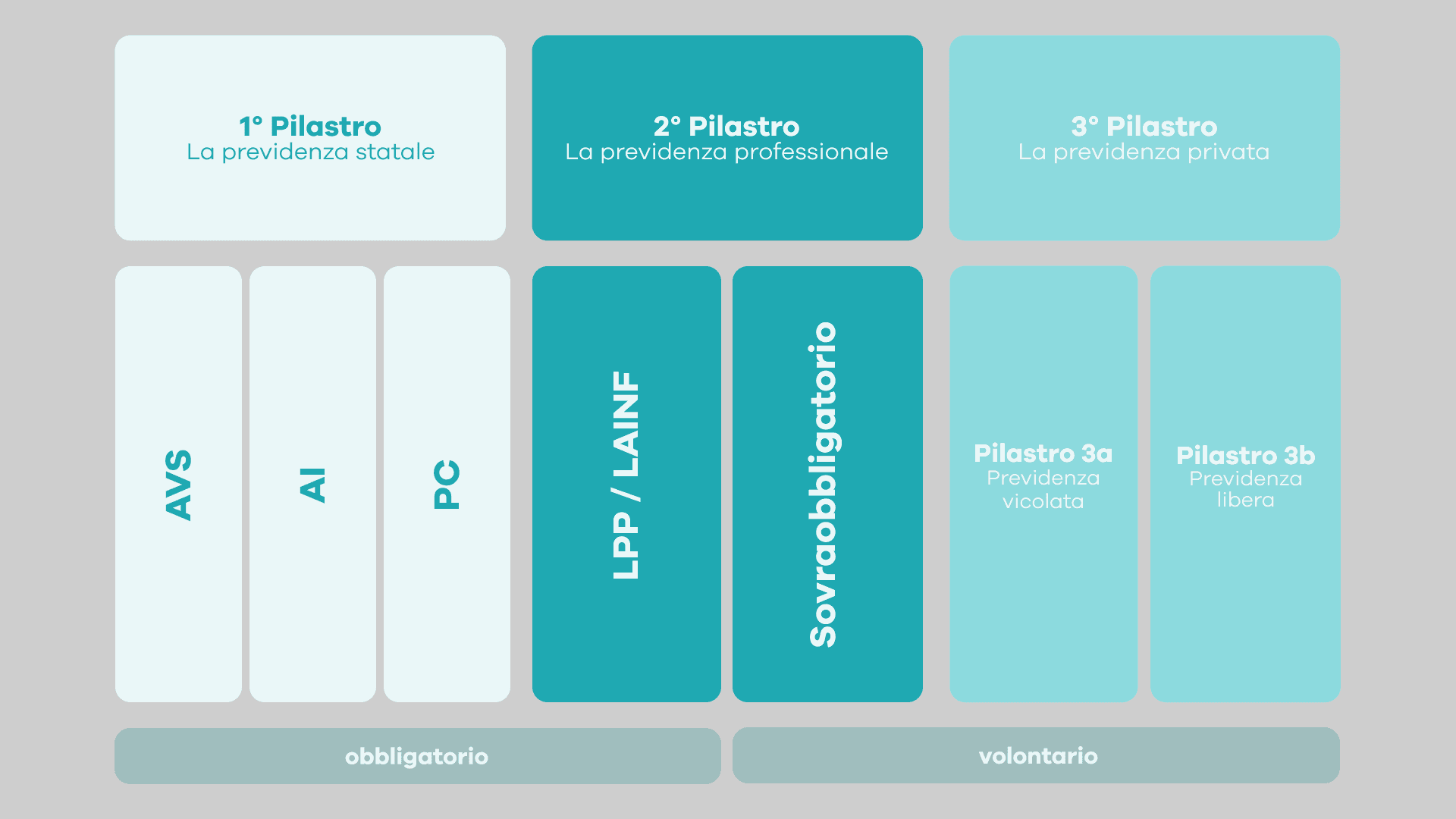 In Svizzera, la previdenza si basa su un sistema di tre pilastri e garantisce che le persone in Svizzera siano finanziariamente protette nella vecchiaia, in caso di invalidità o di decesso. La previdenza statale e professionale (1° e 2° pilastro) è obbligatoria e viene completato dalla previdenza privata volontaria (3° pilastro). Questi tre pilastri si integrano tra loro e costituiscono insieme il fondamento della nostra sicurezza sociale e finanziaria.