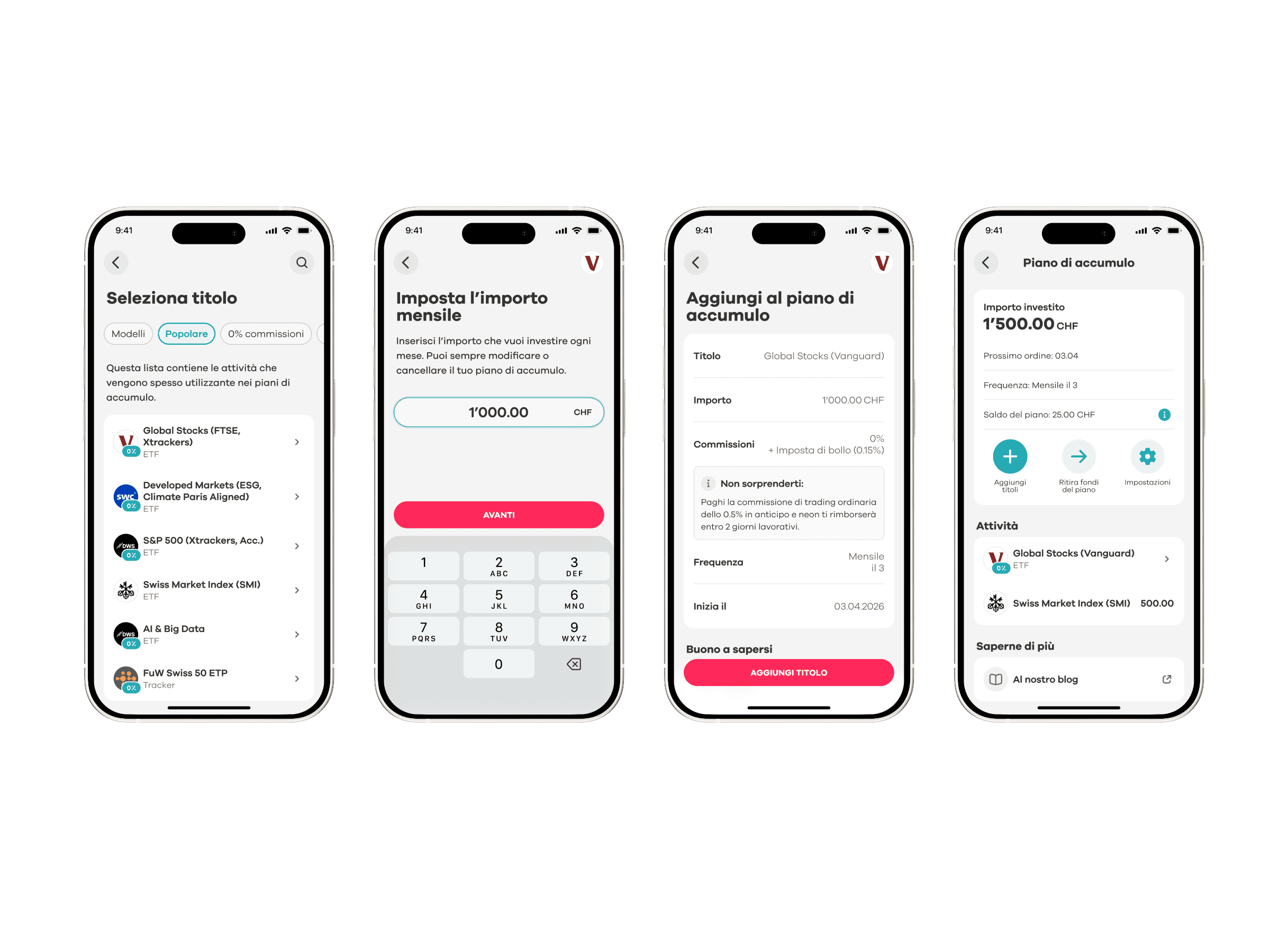 Puoi impostare i piani di accumulo senza costi supplementari. E, in ogni caso, con noi non dovrai preoccuparti di pagare commissioni di deposito per il tuo portafoglio. L’unico costo è rappresentato dalle commissioni di trading, pari allo 0,5% del prezzo di acquisto o di vendita per transazione nel caso delle azioni svizzere e tutti gli ETF e all’1% per le azioni internazionali (nessuna commissione aggiuntiva per il cambio di valuta).