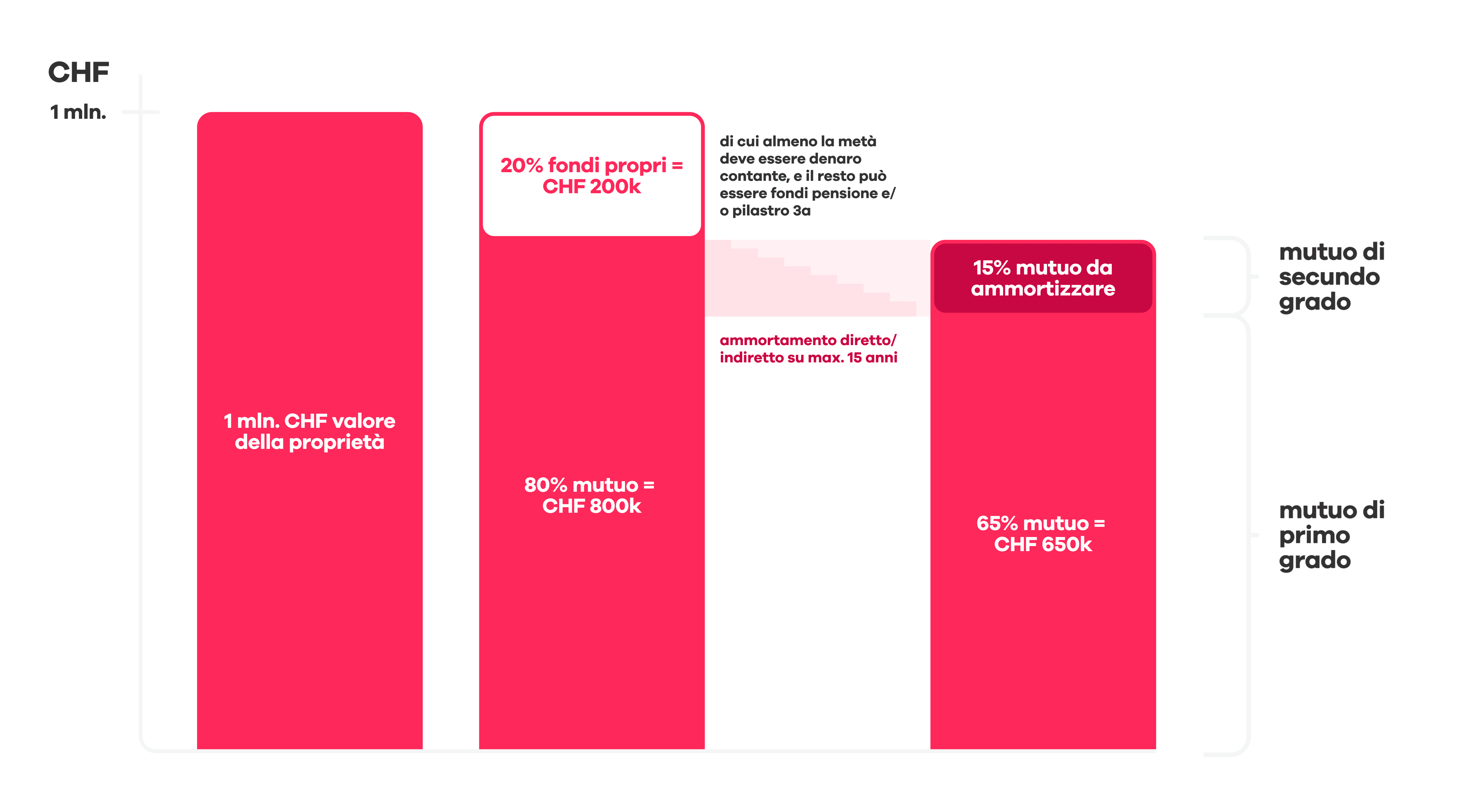 L’intero processo di rimborso del mutuo si chiama «ammortamento», la parte che gli istituti finanziari svizzeri ti chiederanno di ripagare prende il nome di «ipoteca di secondo grado», mentre la parte che rimarrà (nella maggior parte dei casi) e consentirà di ottenere le detrazioni fiscali è detta «ipoteca di primo grado». Ipoteca di primo e di secondo grado insieme rappresentano fino all’80% del valore dell’immobile (ovvero il tuo LTV).